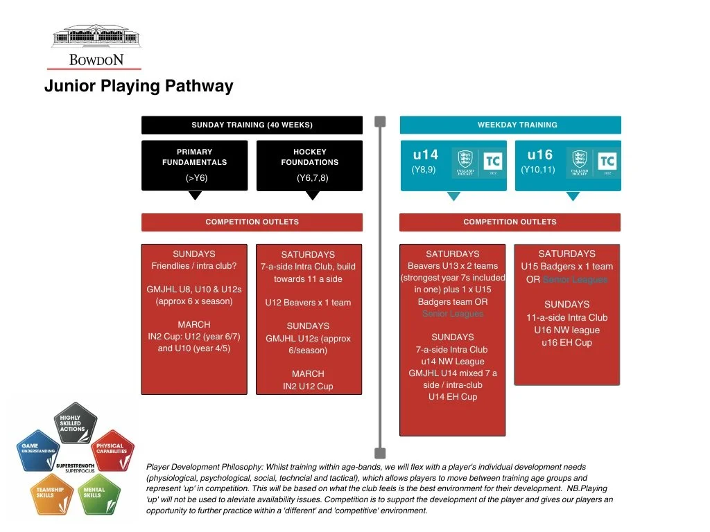 Whilst training within age-bands, we will flex with a player's individual development needs, which allows players to move between training age groups and represent 'up' in competition.
